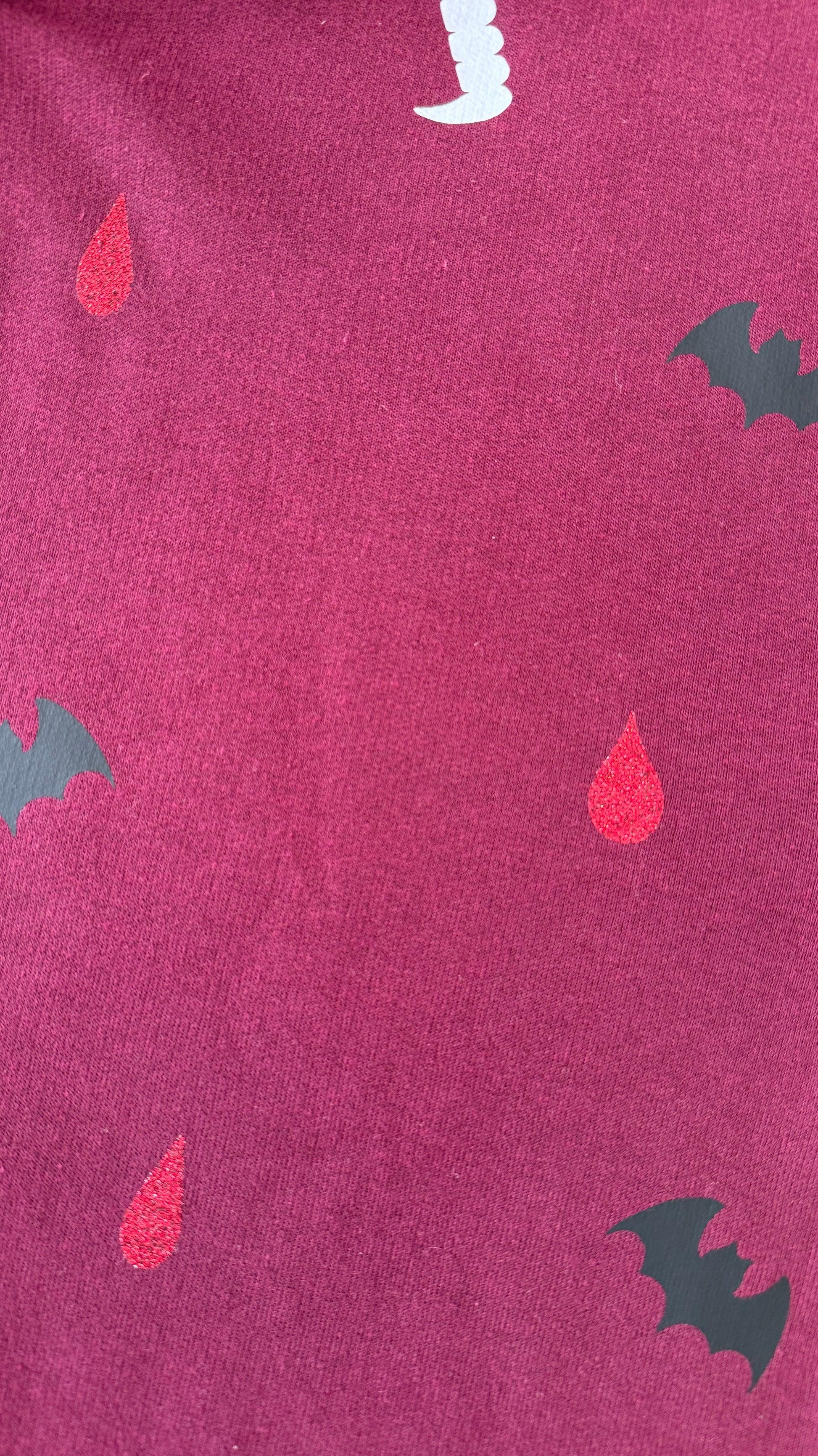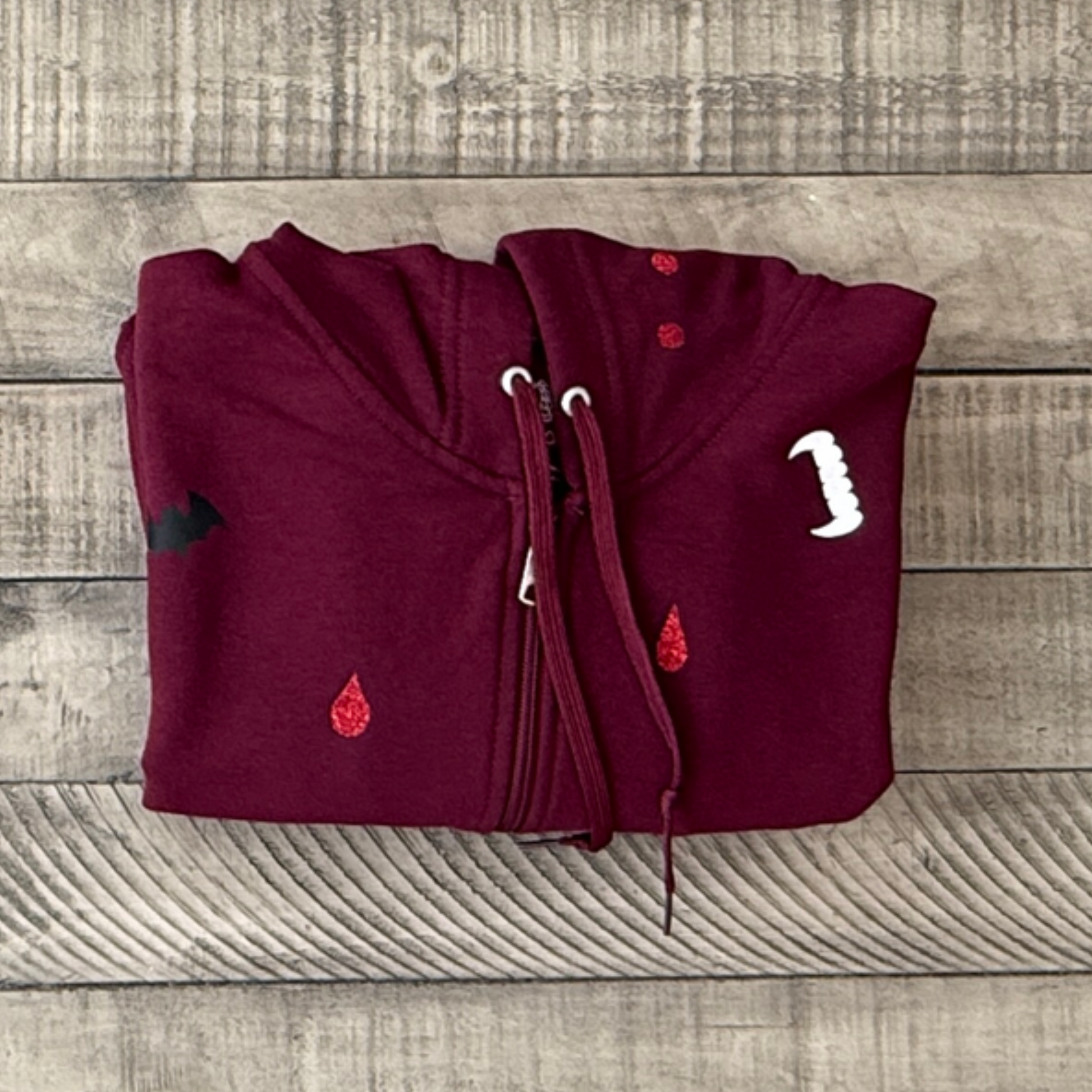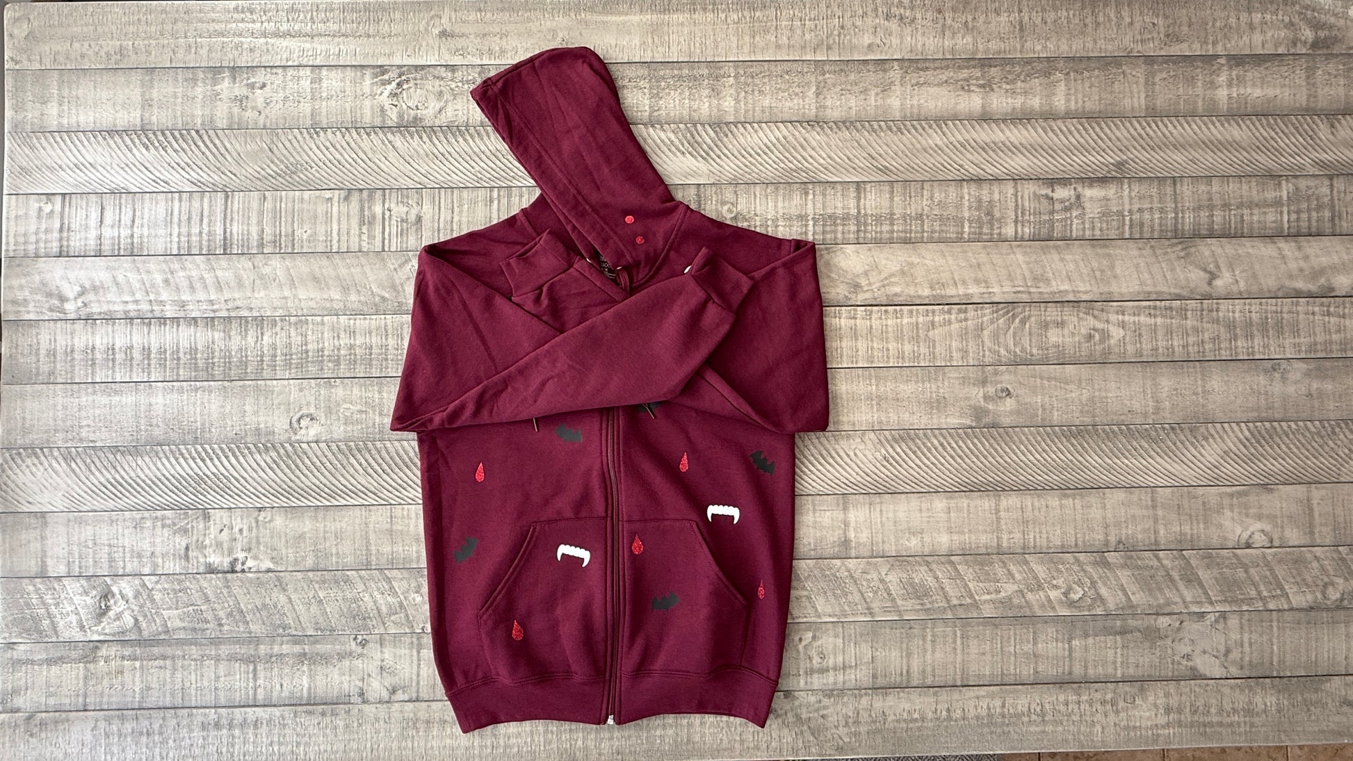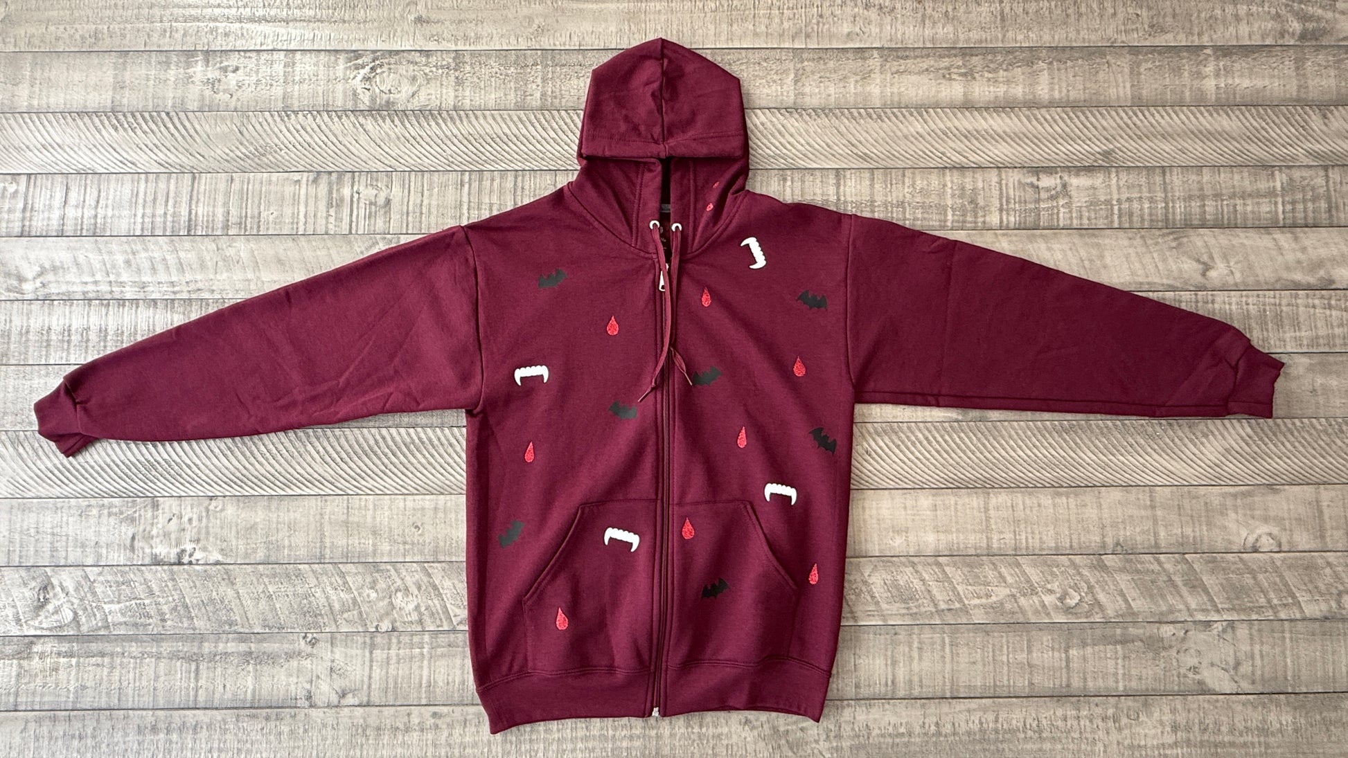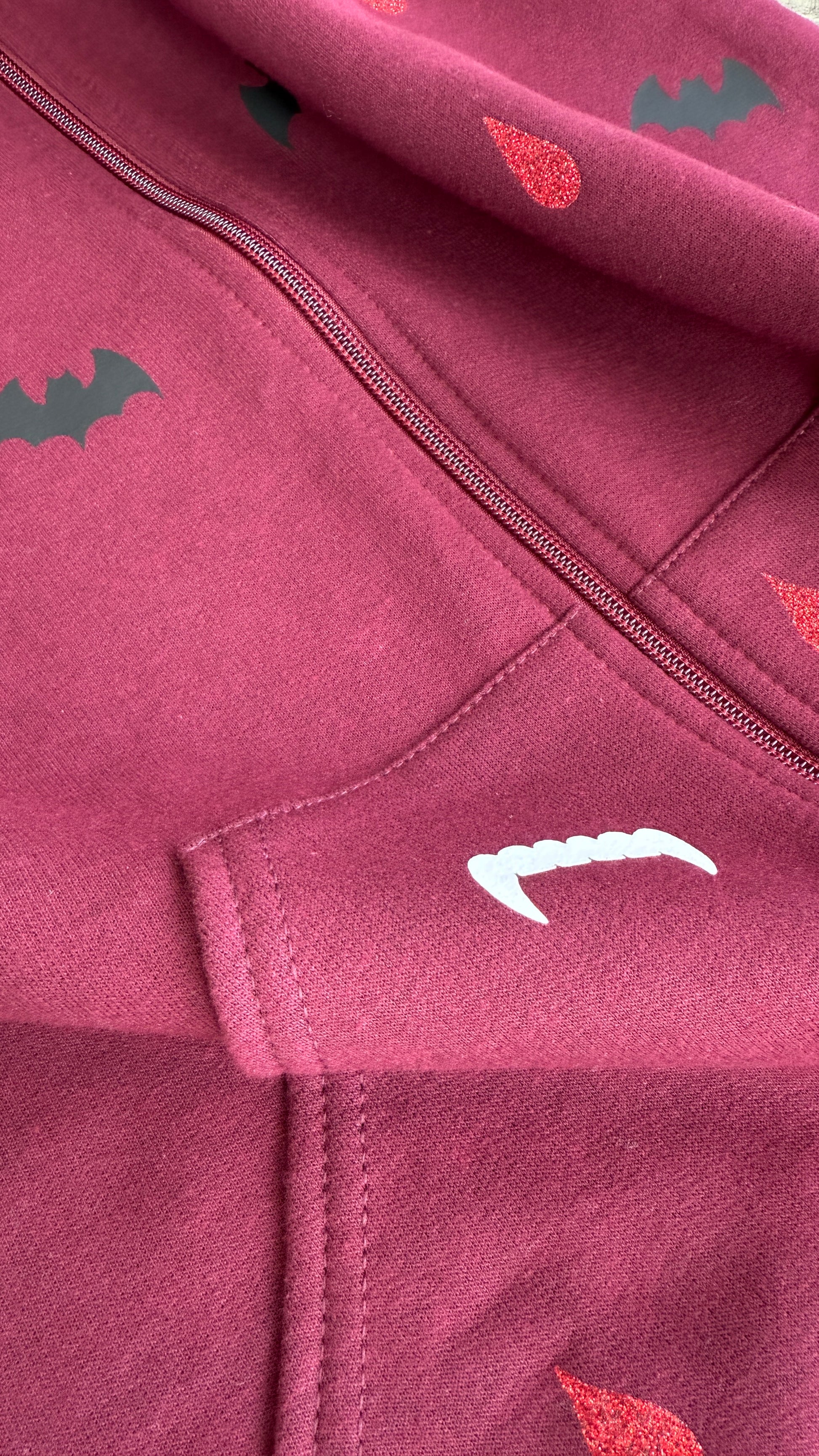 Get ready for spooky season with our maroon zip-up hoodie! Featuring glittery blood drops that sparkle, mischievous bats fluttering around, and cheeky fangs, this hoodie is the perfect blend of cozy and playful. Ideal for chilly autumn nights or Halloween parties, it's your go to piece for embracing that fun, spooky style! š¦āØš