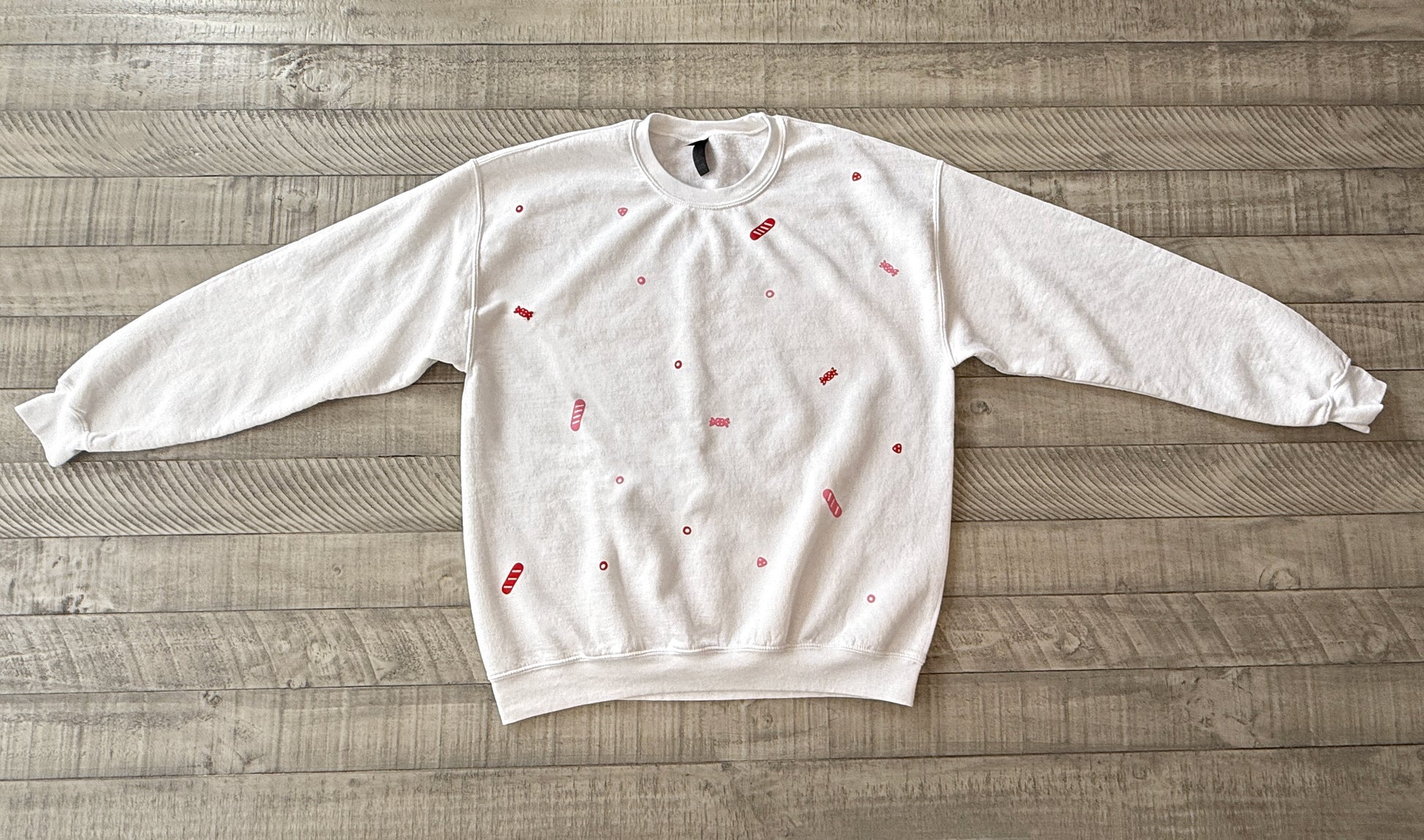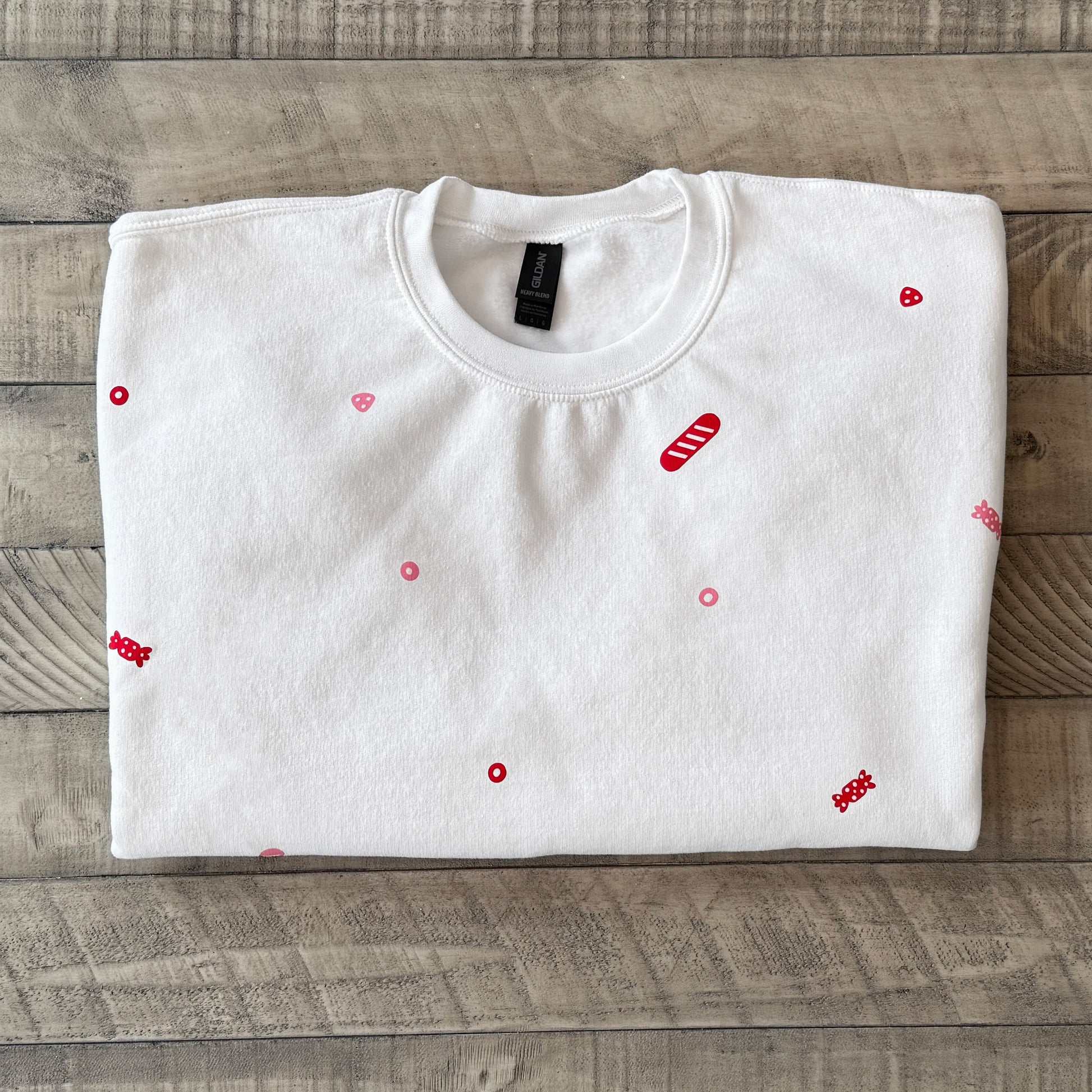 Introducing the sweetest addition to your wardrobe: a crisp white sweatshirt that’s sugar, spice, and everything nice! This delightful piece features vibrant, colorful candy designs ironed onto the front that are sure to make your heart skip a beat. Soft and cozy, this sweatshirt is perfect for snuggling up while binge-watching your favorite shows or heading out for a casual day with friends. It’s like wearing a candy shop—without the worry of sugar rushes or sticky fingers! Pair it with your favorite jeans or comfy leggings, and get ready to spread sweetness and smiles everywhere you go. Get ready to turn heads and spark cravings with this fun and fabulous piece! 🍬🍭🍫✨